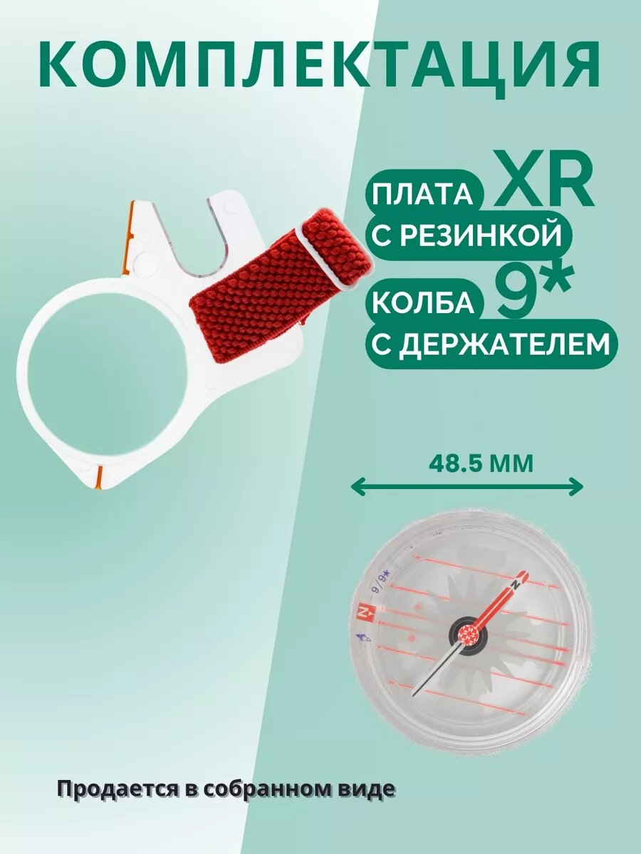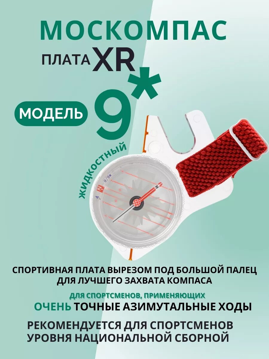 Москомпас модель 9* предназначена для спортсменов, предпочитающих стиль быстрого ориентирования. Это самый быстрый компас. От модели 9 отличается еще большей стабильностью, обусловленной конструкцией стабилизирующего круга. Наиболее популярная модель у элитных спортсменов, использующих азимутальные ходы. Укороченное плато XR предназначено под большой палец правой руки. Специальный ремешок для крепления надежно фиксирует компас на пальце. Конструкция этой модели позволяет легко сверять направление бега по карте. На плате предусмотрено отверстие для крепления лупы, с которой намного удобнее читать карту.
