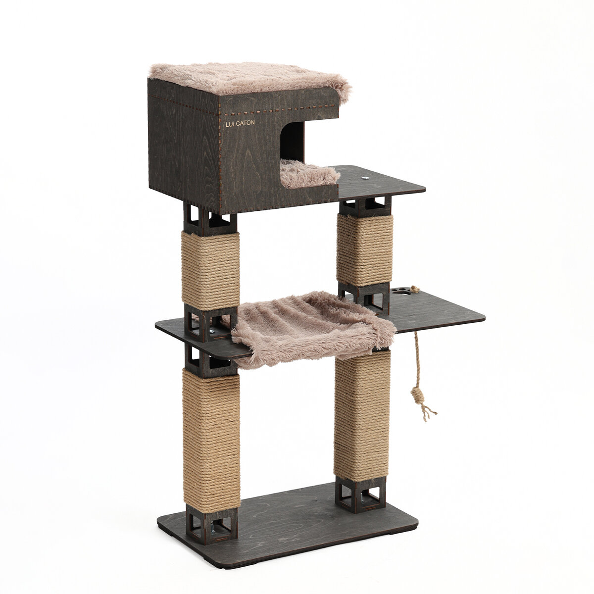 Домик для кошки - новинка от LUI CATON с домиком, гамаком, когтеточкой и лежанками. Это новая модель отличается широкой функциональностью и стильным дизайном. Игровой комплекс имеет следующие размеры в собранном виде: 40х70х110 см. Игровой комплекс идеально подходит большинству пород кошек и котов. Очень интересен для котят и в тоже время удобен для пожилых кошек, которым не хочется или нельзя прыгать. Благодаря боковой полке кошка может без резких движений подниматься и спускаться по игровому комплексу. Плотная намотка джутового каната. Под брендом LUI CATON вы можете приобрести товары для животных ручной работы наивысшего качества.