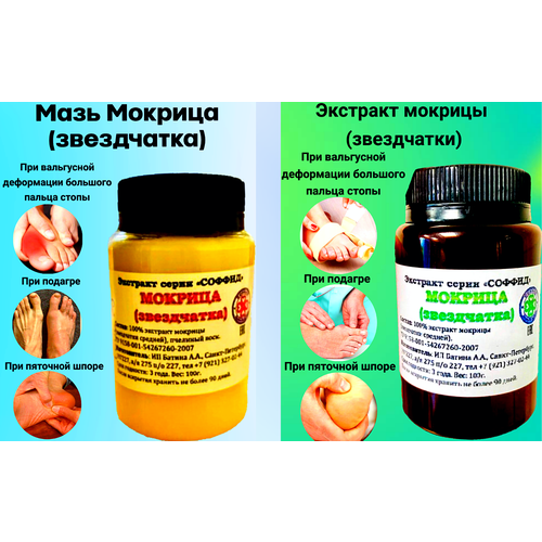 Комплекс от подагры, пяточной шпоры и вальгусной деформации 100г. Соффид Описание: Свежая трава мокрица (звездчатка средняя) с давних времен применяется травниками и знахарями. Современные научные исследования подтверждают противовоспалительное и болеутоляющее действие данного растения. Комплекс средств от подагры, пяточной шпоры и вальгусной деформации включает в себя: 1. Экстракт мокрицы (звездчатки) для внутреннего применения. Состав: 100% экстракт мокрицы (звездчатки средней). Применение. Курсом принимать 1 раз в день, начиная с 5 капель и добавляя ежедневно по 1 капле. После достижения 30 капель аналогичный прием в обратную сторону до 5 капель. Прием утром или на ночь. Средство разводится в ½ стакана воды. При необходимости курс повторить. 2. Мазь с экстрактом мокрицы (звездчатки). Состав: 100% экстракт травы мокрицы (звездчатки средней), пчелиный воск. Применение: компрессы от 40 мин до 8 часов, аппликации. Данного комплекса хватит на 1 курс применения (1-1,5 мес). При необходимости курс повторить. Противопоказания: гипотония, беременность, период лактации, язва и гастрит в период обострения, индивидуальная непереносимость. 3. Комплекс с эмульсией (на фото экстракт + коричневая банка). Название: Комплекс от подагры, пяточной шпоры и вальгусной деформации 100г. Соффид Описание: Свежая трава мокрица (звездчатка средняя) с давних времен применяется травниками и знахарями. Современные научные исследования подтверждают противовоспалительное и болеутоляющее действие данного растения. Комплекс средств от подагры, пяточной шпоры и вальгусной деформации включает в себя: 1. Экстракт мокрицы (звездчатки) для внутреннего применения. Состав: 100% экстракт мокрицы (звездчатки средней). Применение. Курсом принимать 1 раз в день, начиная с 5 капель и добавляя ежедневно по 1 капле. После достижения 30 капель аналогичный прием в обратную сторону до 5 капель. Прием утром или на ночь. Средство разводится в ½ стакана воды. При необходимости курс повторить. 2. Эмульсия с экстрактом мокрицы (звездчатки). Состав: 100% экстракт травы мокрицы (звездчатки средней), ксантановая камедь. Применение: компрессы от 40 мин до 8 часов, аппликации. Данного комплекса хватит на 1 курс применения (1-1,5 мес). При необходимости курс повторить. Противопоказания: гипотония, беременность, период лактации, язва и гастрит в период обострения, индивидуальная непереносимость.
