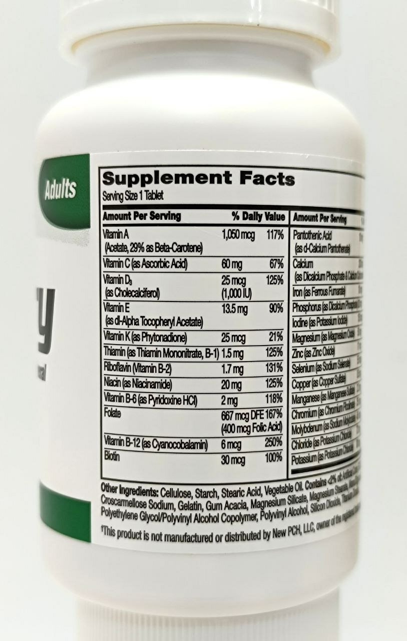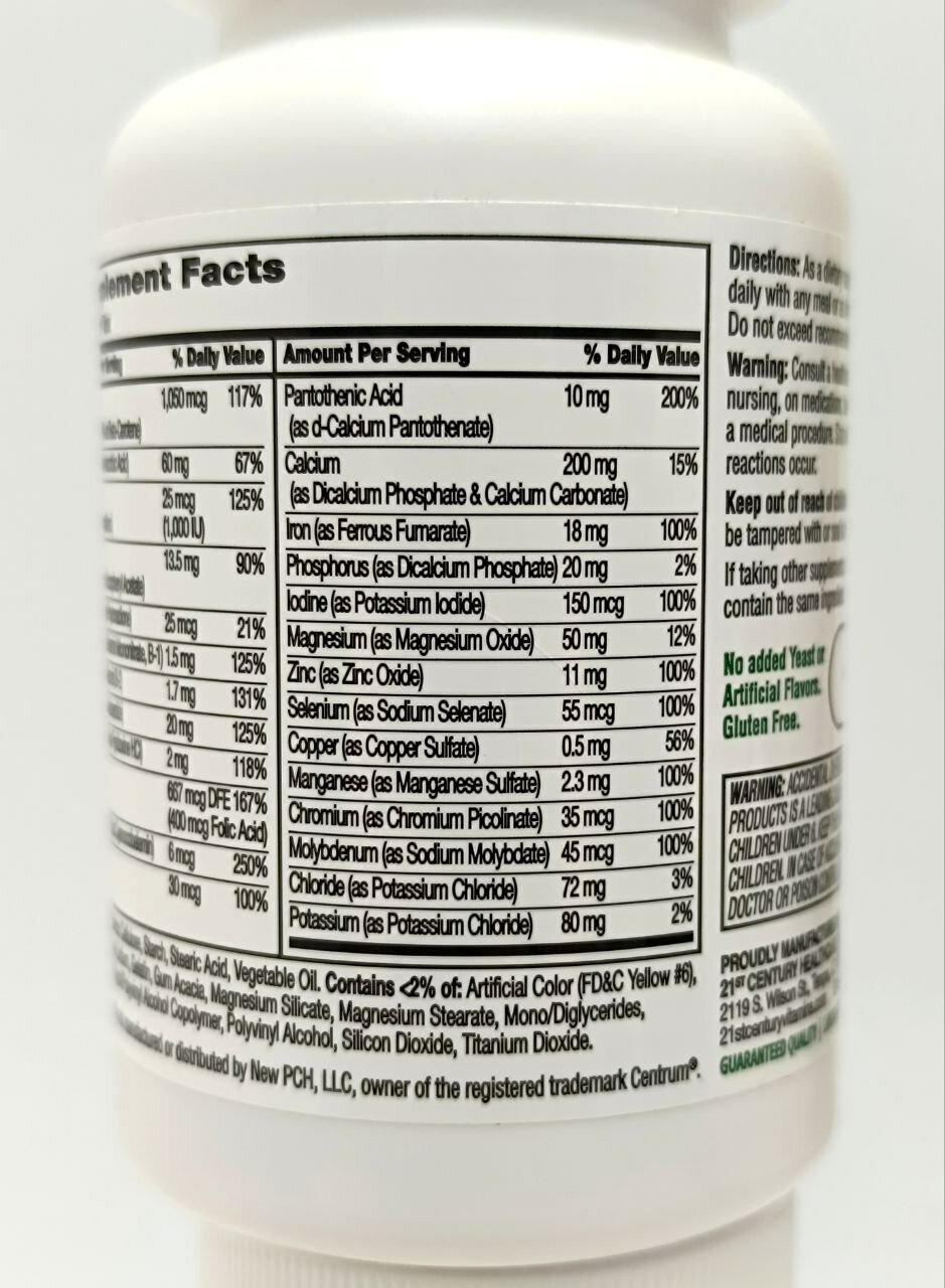 витамин А (ацетат, 29% в виде бета-каротина) 1050 мкг 117% Витамин С (в виде аскорбиновой кислоты) 60 мг 67% Витамин D3 (как холекальциферол) 25 мкг (1000 МЕ) 125% Витамин Е (в виде dl-альфа-токоферола ацетата) 13,5 мг 90% Витамин К (как фитонадион) 25 мкг 21% Тиамин (как мононитрат тиамина, B-1) 1,5 мг 125% Рибофлавин (витамин B-2) 1,7 мг 131% Ниацин (как ниацинамид) 20 мг 125% Витамин B6 (в виде пиридоксина гидрохлорида) 2 мг 118% Фолат 667 мкг DFE (400 мкг фолиевой кислоты) 167% Витамин B12 (как цианокобаламин) 6 мкг 250% биотин 30 мкг 100% Пантотеновая кислота (как пантотенат d-кальция) 10 мг 200% Кальций (в виде дикальцийфосфата и карбоната кальция) 200 мг 15% Железо (в виде фумарата железа) 18 мг 100% Фосфор (в виде дикальцийфосфата) 20 мг 2% Йод (как йодид калия) 150 мкг 100% Магний (в виде оксида магния) 50 мг 12% Цинк (в виде оксида цинка) 11 мг 100% Селен (как селенат натрия) 55 мкг 100% Медь (в виде сульфата меди) 0,5 мг 56% Марганец (в виде сульфата марганца) 2,3 мг 100% Хром (как пиколинат хрома) 35 мкг 100% Молибден (как молибдат натрия) 45 мкг 100% Хлорид (как хлорид калия) 72 мг 3% Калий (в виде хлорида калия) 80 мг 2%; целлюлоза, крахмал, стеариновая кислота, растительное масло; содержит <2%: искусственного красителя (желтый 6 FD&C), кроскармеллоза натрия, желатин, силиката магния, стеарат магния, мальтодекстрин, моно/диглицериды, сополимер ПЭГ/ПВА, поливиниловый спирт, диоксид кремния, диоксид титана