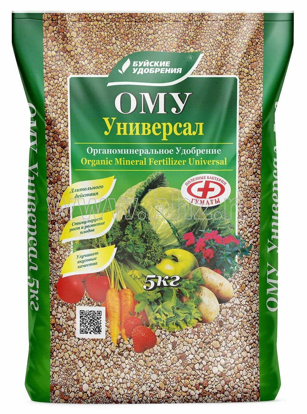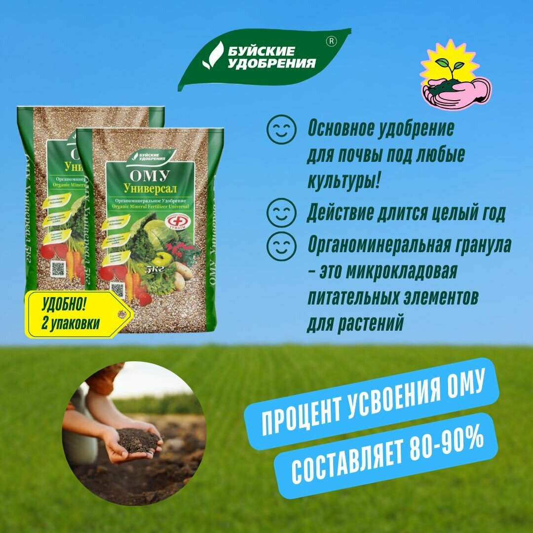 Комплексное гранулированное органоминеральное удобрение ОМУ Универсал от Буйских удобрений - это идеальное решение для всех любителей садоводства и огородничества. Удобрение представлено в упаковках по 5 кг, что делает его легко доступным и удобным в использовании. Общее количество - 10 кг, что позволяет обеспечить полноценное питание для различных культур. Это универсальное средство подходит для разнообразных растений, включая плодово-ягодные, овощные, цветочные, декоративные деревья и кустарники. С помощью данного удобрения вы сможете значительно повысить здоровье и урожайность ваших растений, так как оно содержит все необходимые элементы для их полноценного развития. Гранулированная форма обеспечивает равномерное распределение питательных веществ в почве, что является важным фактором для роста и цветения. Применение органоминерального удобрения позволяет улучшить структуру почвы и повысить её плодородие. Этот продукт также способствует активному развитию корневой системы, что является залогом крепкого роста растений. Удобство в использовании позволяет вам быстро и легко подкармливать ваши растения, чтобы они радовали вас обильным урожаем и ярким цветением. Удобрение подходит для применения на всех типах участков, будь то сад, огород или газон. Благодаря своей комплексной формуле, ОМУ Универсал идеально сбалансировано, что гарантирует растениям необходимые микроэлементы и придает им силу и здоровье. Не упустите возможность создать прекрасный сад или урожайный огород с помощью удобрения от Буйских удобрений. Комплексное гранулированное органоминеральное удобрение - это ваш верный помощник в достижении успеха в садоводстве, обеспечивая здоровье и декоративность ваших культур. Состав: N (%): 7; P2O5 (%): 7; K2O (%): 8; MgO (%): 1.5; S (%): 3.67 Микроэлементы: Cu-0.01; Zn-0.01; Fe-0.02; Mn-0.05; B-0.02 Гуминовые соединения: 11 Не содержит хлор (Cl). Полезные бактерии: Bacillus Subtilis – 700 тыс. КОЕ/г, Bacillus Mucilaginosus – 300 тыс. КОЕ/г 50-100 г на кв. м при внесении вразброс с последующей перекопкой почвы 10 г на литр грунта при приготовлении грунта для выращивания рассады 20-60 г при посадке локальное внесении в посадочную лунку ОМУ "Универсал" рекомендуется применять в качестве основного удобрения при подготовке почвы для выращивания полевых, садовых, огородных и декоративных культур, для выращивания рассады, а также декоративных кустарников. ОМУ - комплексное гранулированное удобрение пролонгированного действия, производится на основе низинного торфа, в состав которого входят гуминовые вещества, макро- и микроэлементы. ОМУ работает ранней весной, когда растениям необходима стимуляция роста, летом - в период активной вегетации и осенью, укрепляя растения на зиму благодаря его пролонгированному действию. В процессе производства ОМУ минеральные элементы питания закрепляются в органической грануле. Более подвижные азот и калий не вымываются поливными водами из гранулы, как это происходит с минеральными удобрениями, а фосфор не образует нерастворимых соединений в почвенном растворе. Органоминеральная гранула – это микрокладовая питательных элементов для растений. За счет этого коэффициент использования питательных элементов, содержащихся в ОМУ, в 1,5 раза выше по сравнению с минеральными удобрениями, где усваивается максимум 25–30% питательных веществ, в то время как 