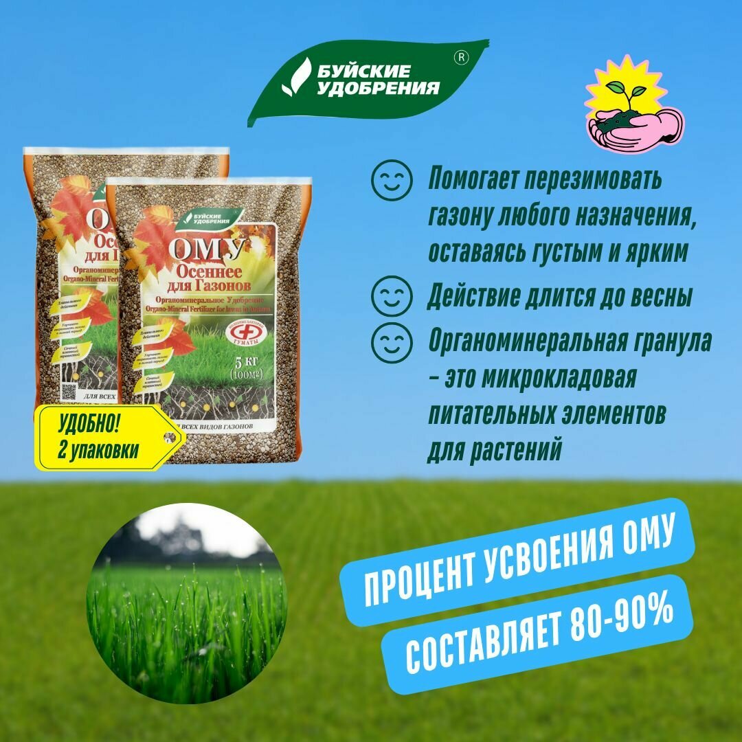 Удобрение ОМУ Осеннее для Газонов от Буйских удобрений - это универсальный продукт, который можно использовать как для газонов, так и для сада. Он помогает стимулировать корнеобразование, рост и питание растений, а также повышает их декоративность.