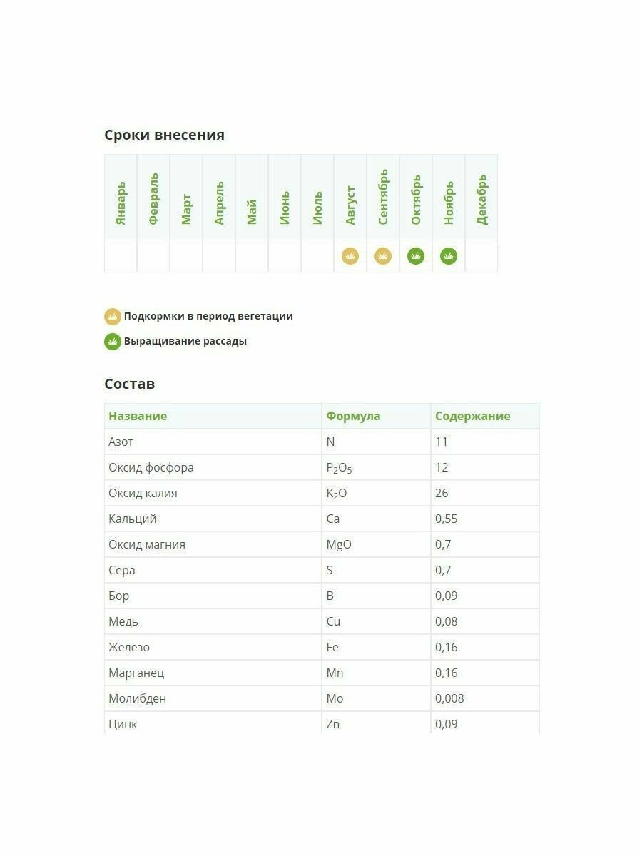 Продукт произведен в России и имеет срок годности 1825 дней. Фасовка удобрения составляет 10 кг, что делает его экономичным и удобным в использовании. Форма выпуска средства - гранулы, что обеспечивает простоту и удобство применения.