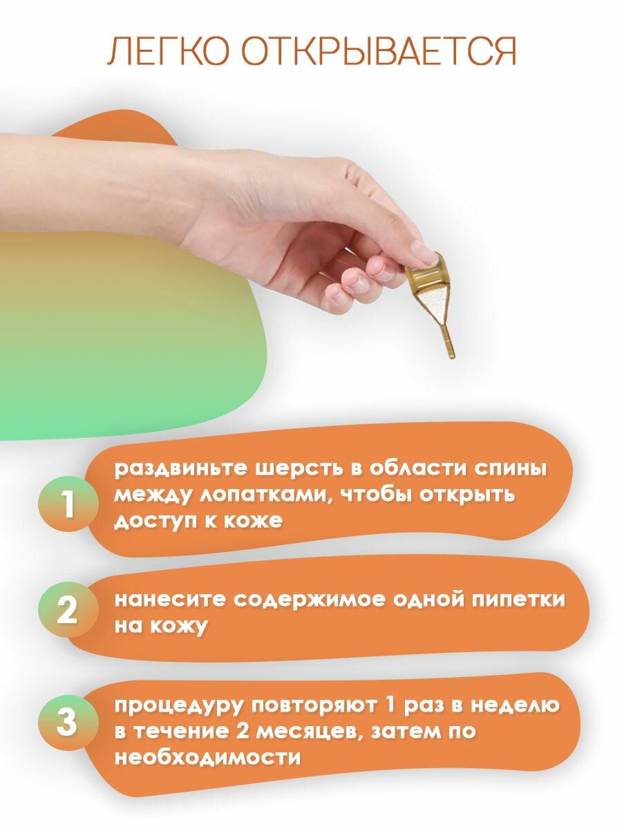 - Легкость использования: наносится на кожу между лопатками (1 пипетка в неделю).