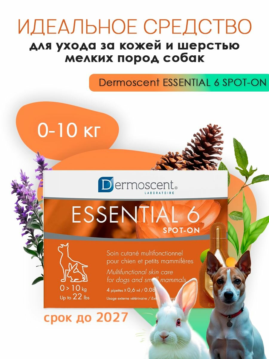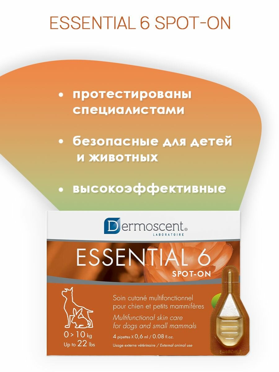 Dermoscent Essential 6 spot-on — это первое запатентованное средство, которое обеспечивает простое и эффективное решение проблем кожи у собак, кошек и мелких млекопитающих (кроликов, хорьков, морских свинок, хомяков, крыс, мышей) до 10 кг: