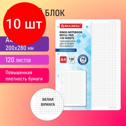 Внимание! Товар продается комплектом:[Сменный блок для тетради на кольцах большой формат А4 120 л, BRAUBERG, повышенной плотности, белый, 404516] X 10 шт. Блок состоит из 120 листов офсетной бумаги белого цвета повышенной плотности 70 г/м2. Линовка - клетка с полями.