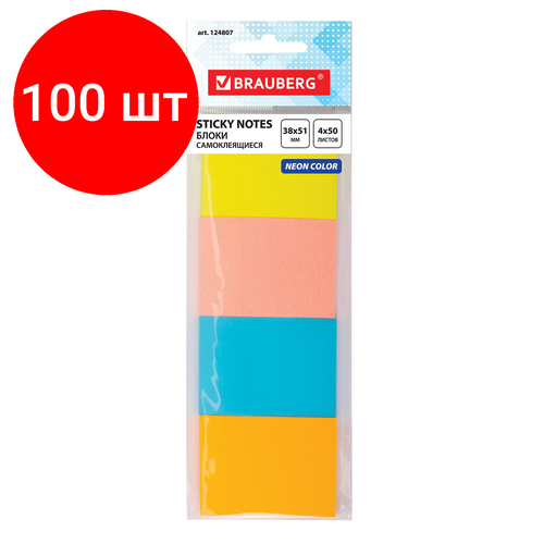 Купить Комплект 100 шт, Блок самоклеящийся (стикеры), BRAUBERG, неоновый, 38х51 мм, 4 цвета х 50 листов, 124807 с доставкой по всей России.