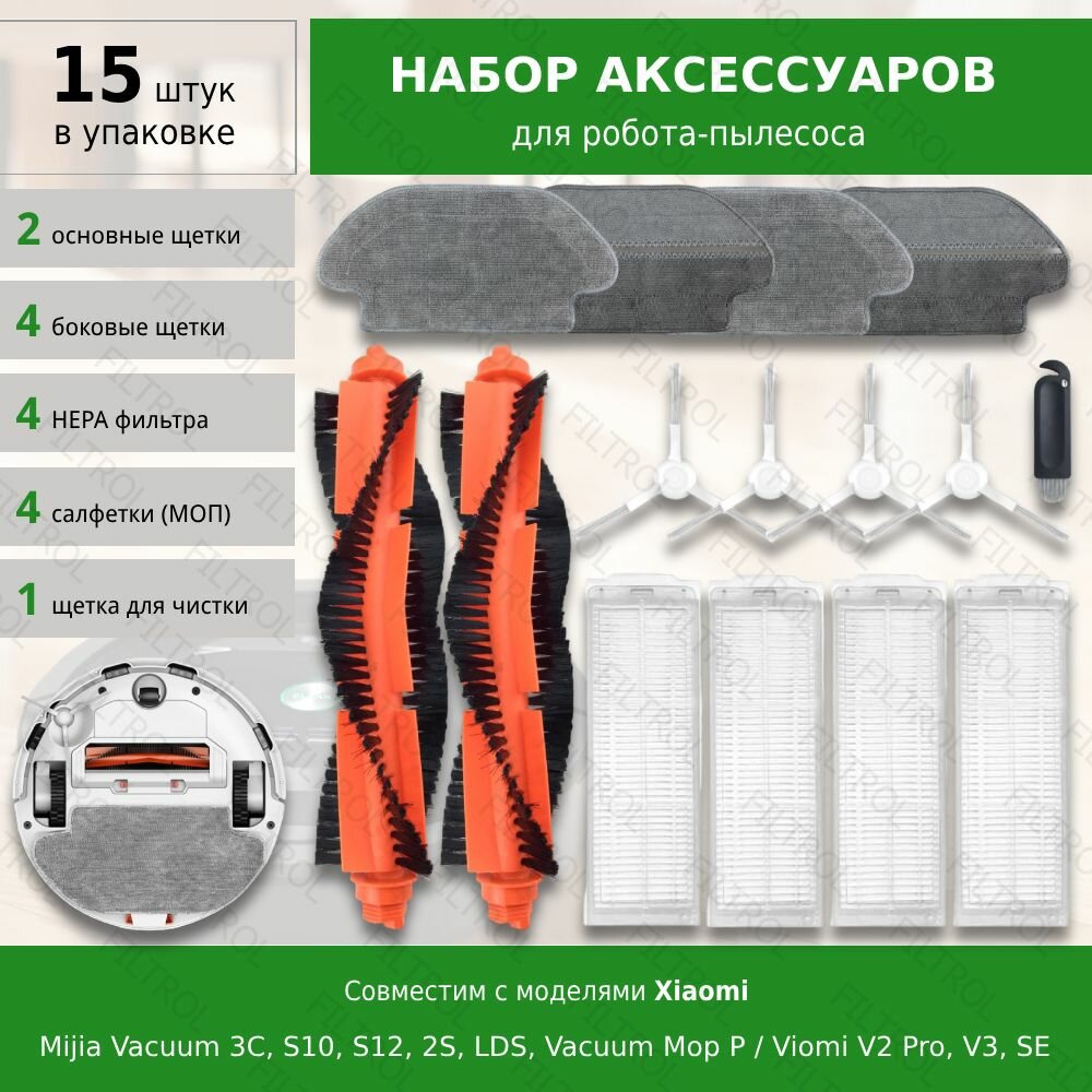 Готовый комплект из 15-ти аксессуаров, который полностью совместим с робот-пылесосами: * Mijia Vacuum 3C * Mi Robot Vacuum S10 * Mi Robot Vacuum S12 * Mi Robot Vacuum-Mop 2S (XMSTJQR2S) * Viomi V2 Pro * Viomi V3 * Viomi SE * Mijia LDS Vacuum Cleaner (STYJ02YM) * Mi Robot Vacuum Mop Pro * Mi Robot Vacuum-Mop P (STYTJ02YM) * Mi Robot Vacuum-Mop P Black (SKV4109GL) * Mi Robot Vacuum-Mop P White (SKV4110GL) В данный комплект входит: * Основная щетка (2 шт.) - это незаменимый аксессуар для поддержания чистоты вашего дома. Она имеет высокую эффективность уборки благодаря своей уникальной конструкции, которая позволяет собирать даже самые мелкие частицы пыли и грязи. Кроме того, эта основная щетка имеет дополнительную защиту от износа, что делает её долговечной и надежной. * Боковые щетки (4 шт.) - это отличный выбор для тех, кто ценит чистоту и порядок в доме. Эти щетки изготовлены из высококачественных материалов и имеют уникальную конструкцию, которая позволяет им эффективно собирать даже мельчайшие частицы пыли и мусора. Они имеют дополнительную защиту от износа и позволяют проникать даже в самые труднодоступные места. * HEPA фильтры (4 шт.) - это высококачественный аксессуар, который обеспечивает эффективную фильтрацию воздуха и защищает пылесос от попадания пыли, грязи и аллергенов. Использование этих HEPA-фильтров является отличным выбором для тех, кто заботится о здоровье своей семьи и хочет обеспечить максимальную чистоту дома. Они легко устанавливаются и заменяются, что делает процесс обслуживания пылесоса простым и удобным. * Салфетки для влажной уборки из микрофибры (4 шт.) так же является незаменимым аксессуаром для поддержания чистоты в вашем доме. Основная польза от приобретения салфеток из микрофибры заключается в возможности быстро и легко поддерживать чистоту без использования химических средств и повреждения поверхностей. Они прослужат долго и обеспечат надежность и эффективную уборку для вашего робота-пылесоса Xiaomi Roborock, что позволит долго наслаждаться чистотой в доме и комфортом. * Инструмент (1 шт.) для очистки HEPA фильтра и основной щетки. внимание:1) Данный комплект является альтернативным, совместимый с брендом.2) Боковые щётки могут быть погнуты при транспортировки. Положите щётку в горячую воду. Оставьте её на 5-10 минут в горячей воде. После выньте, щётка будет готова к использованию.3) Чтобы ваш пылесос работал на максимальной производительности, фильтры должны промываться один раз в месяц и меняться каждые 3 - 4 месяца. Товарный знак и логотипы Mijia и Viomi являются зарегистрированными товарными знаками соответствующих владельцев. Любое использование торговой марки или названия модели Mijia и Viomi для этого комплекта аксессуаров осуществляется исключительно с целью демонстрации совместимости.