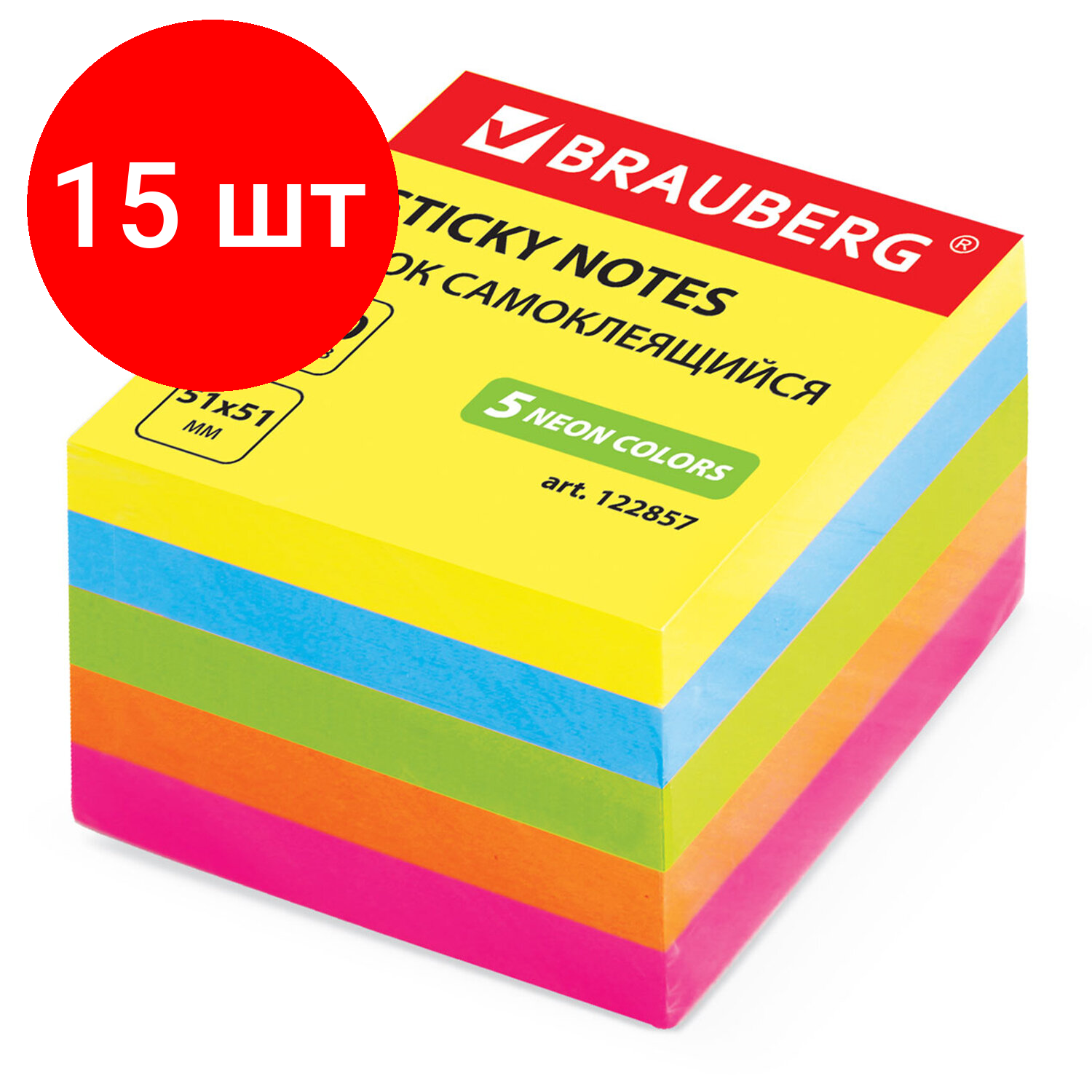 Комплект 15 шт, Блок самоклеящийся (стикеры), BRAUBERG, неоновый, 51х51 мм, 400 листов, 5 цветов, 122857: сравнение цен, характеристики, фото, актуальное наличие и цены.