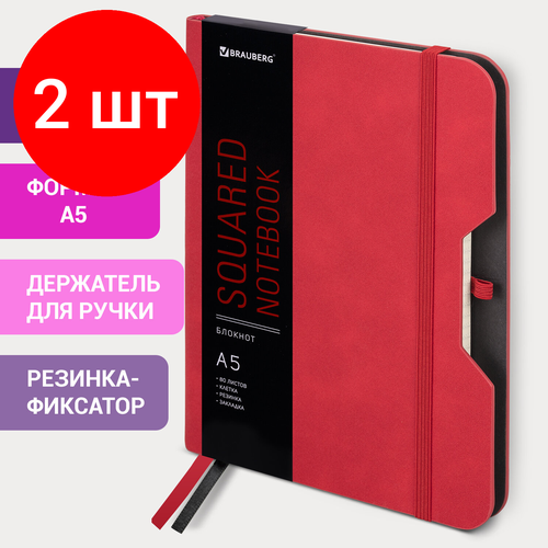 Внимание! Товар продается комплектом:[Блокнот А5 (148х218 мм), BRAUBERG "NOTE", под кожу софт-тач, с резинкой, 80 л, клетка, красный, 113439] X 2 шт. Твердая обложка стилизована под "гладкую кожу". Специальное покрытие "SoftTouch" с повышенными тактильными свойствами придает обложке мягкий, бархатистый эффект. Имеет закругленные уголки, подходит для горячего тиснения и имеет резинку-фиксатор, благодаря чему не раскроется в сумке или портфеле и листы не помнутся. 80 листов позволят зафиксировать большой объем информации. Линовка блока в клетку дает возможность аккуратно заполнить цифровые значения, а также нанести чертежные зарисовки. Внутренний блок выполнен из офсета цвета слоновой кости плотностью 70 г/м2 и крепится к обложке с помощью книжного переплета. Дополнением являются две закладки-ляссе, с помощью которой при необходимости можно быстро открыть или зафиксировать нужную страницу, а также держатель для ручки. Формат блокнота А5 (162х218 мм) позволит владельцу поместить его в кейс или сумку малых габаритов.