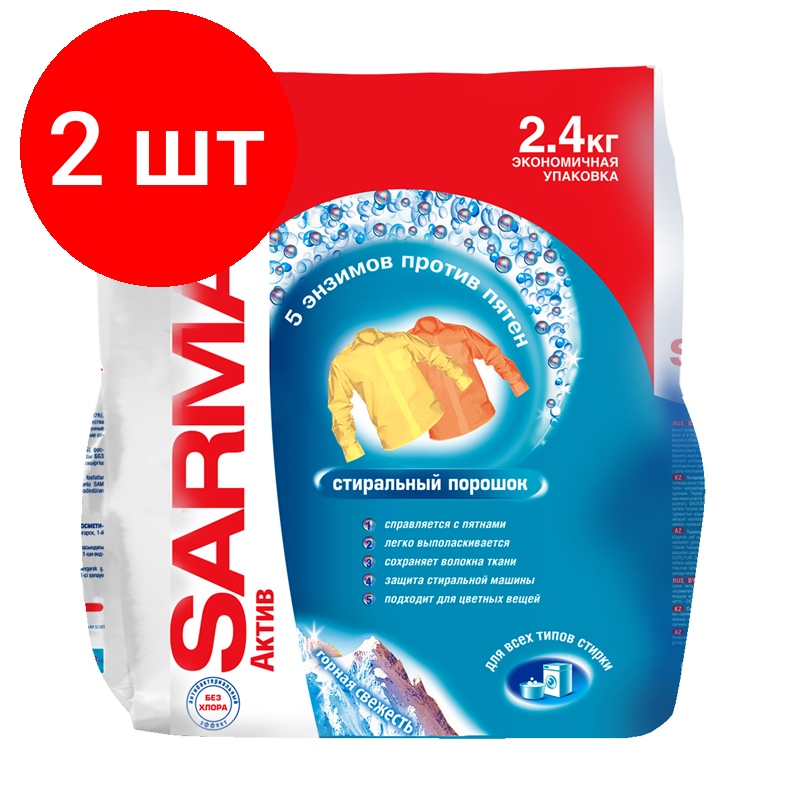 Комплект 2 шт, Порошок для машинной стирки Sarma «Актив. Горная свежесть», 2.4кг: сравнение цен, характеристики, фото, актуальное наличие и цены.