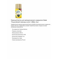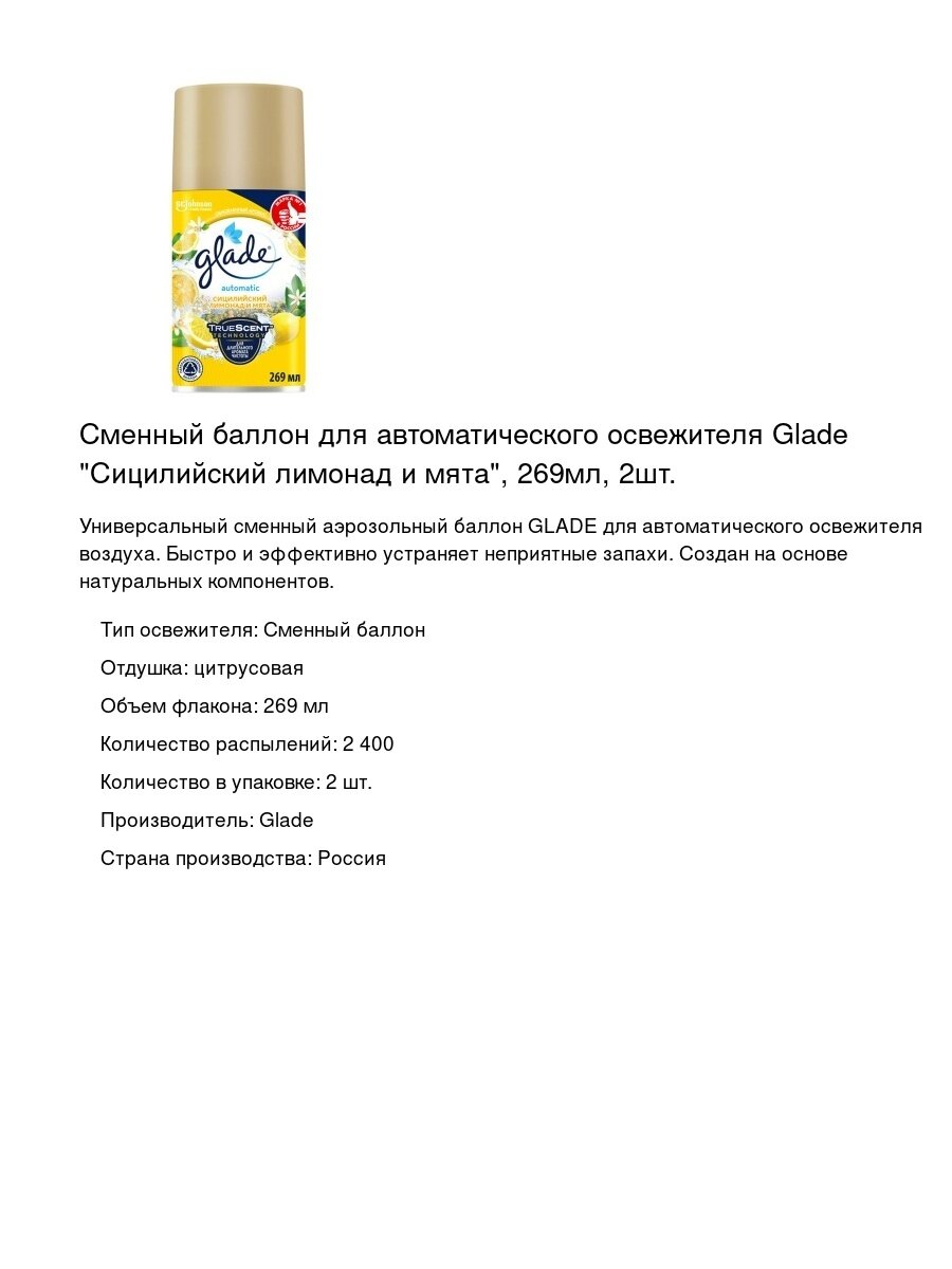 Сменный баллон для автоматического освежителя Glade «Сицилийский лимонад и мята», 269мл, 2шт.: сравнение цен, характеристики, фото, актуальное наличие и цены.