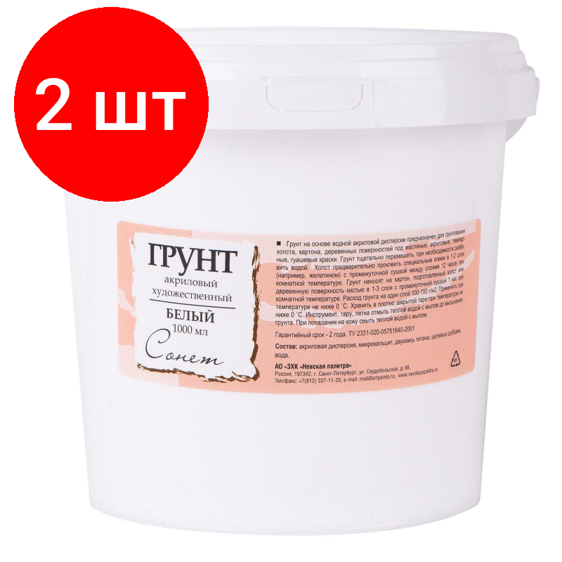 Внимание! Товар продается комплектом:[Грунт акриловый белый Сонет 1л 2125915] X 2 шт. ?Грунт на? ?основе водной акриловой дисперсии предназначен для грунтования холста, картона, деревянных поверхностей под масляные, акриловые, темперные, гуашевые краски. Перед использованием грунт необходимо тщательно перемешать, а? ?при необходимости разбавить водой. Холст предварительно проклеить специальным клеем в? ?1??-??2 слоя с? ?промежуточной сушкой между слоями 12 часов при комнатной температуре.? ?Грунт наносят на? ?картон, подготовленный холст или деревянную поверхность кистью в? ?1??-??3 слоя с? ?промежуточной сушкой 1 час при комнатной температуре. Расход грунта на? ?один слой 100???150 г/??кв.м??. Применять при температуре не? ?ниже 0 °С. Хранить в? ?плотно закрытой таре при температуре не? ?ниже 0 °С. Инструменты, тару, пятна отмыть теплой водой с? ?мылом до? ?высыхания грунта. Состав: акриловая дисперсия, вода, наполнитель, двуокись титана, ??компоненты??.? ?Температура транспортирования/хранения: не? ?ниже 0 °С/не ниже 0 °С.?