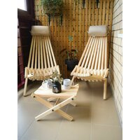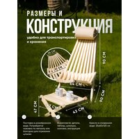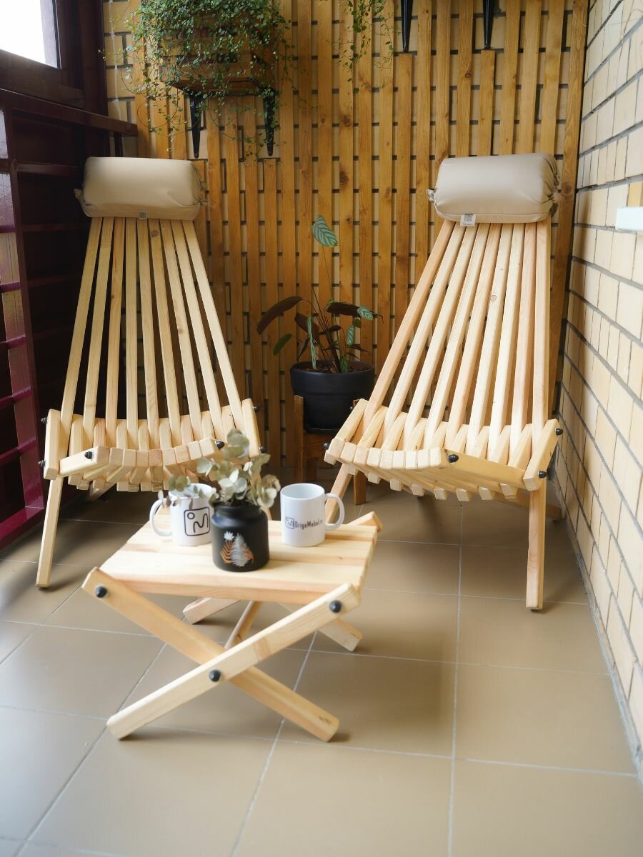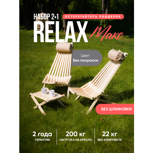 Комплект Релакс MAX 2 кресла с подушками подголовниками и столик. Каркас изделия выполнен из карельской сосны. Выдерживает нагрузку 200 кг. Удобный, складной и эргономичный набор, который предназначен для создания отдыха как в саду, так и в банях, саунах, на верандах и просто в качестве комфортного оборудования при вылазках за город. Из кресел можно обустроить комфортное пространство лофт для встреч большой компанией, например, поставив их вокруг очага, костра, и провести время с семьей, с друзьями на свежем воздухе. Стул со спинкой обеспечивает максимальный комфорт, а за счет того, что конструкция мобильна, его можно использовать как походный стул или рыболовное кресло, а зимой сделать из него кресло для балкона и наслаждаться вечером. После сборки шпильки необходимо отпилить болгаркой или ножовкой по металлу. Шезлонг деревянный имеет эргономичное и комфортное положение (полулежа) в разложенном виде. Кресло мобильное, его легко сложить и перенести с места на место, либо взять с собой для отдыха на природе как туристический стул раскладной, как кемпинговая или ротанговая мебель. Возьмите его на охоту, рыбалку в качестве рыбацкого стула. Изделие не боится осадков, их можно оставлять на улице при любых погодных условиях, также можно использовать как пляжный лежак – при высокой влажности и даже соленом ветре с моря. Его удобно хранить в сложенном виде. Подойдет для подарка мужчине, женщине, любимым, близким и родным на день рождения, новый год, 8 марта, 23 февраля (мужской набор). Шезлонг садовый – идеальная экологичная замена надоевшей и не практичной пластиковой мебели для людей с хорошим вкусом. Продукт идет неокрашенным и без шлифовки, после шлифовки можно наносить масло, антисептик, лак, краску по вашему усмотрению, использовать без покраски.