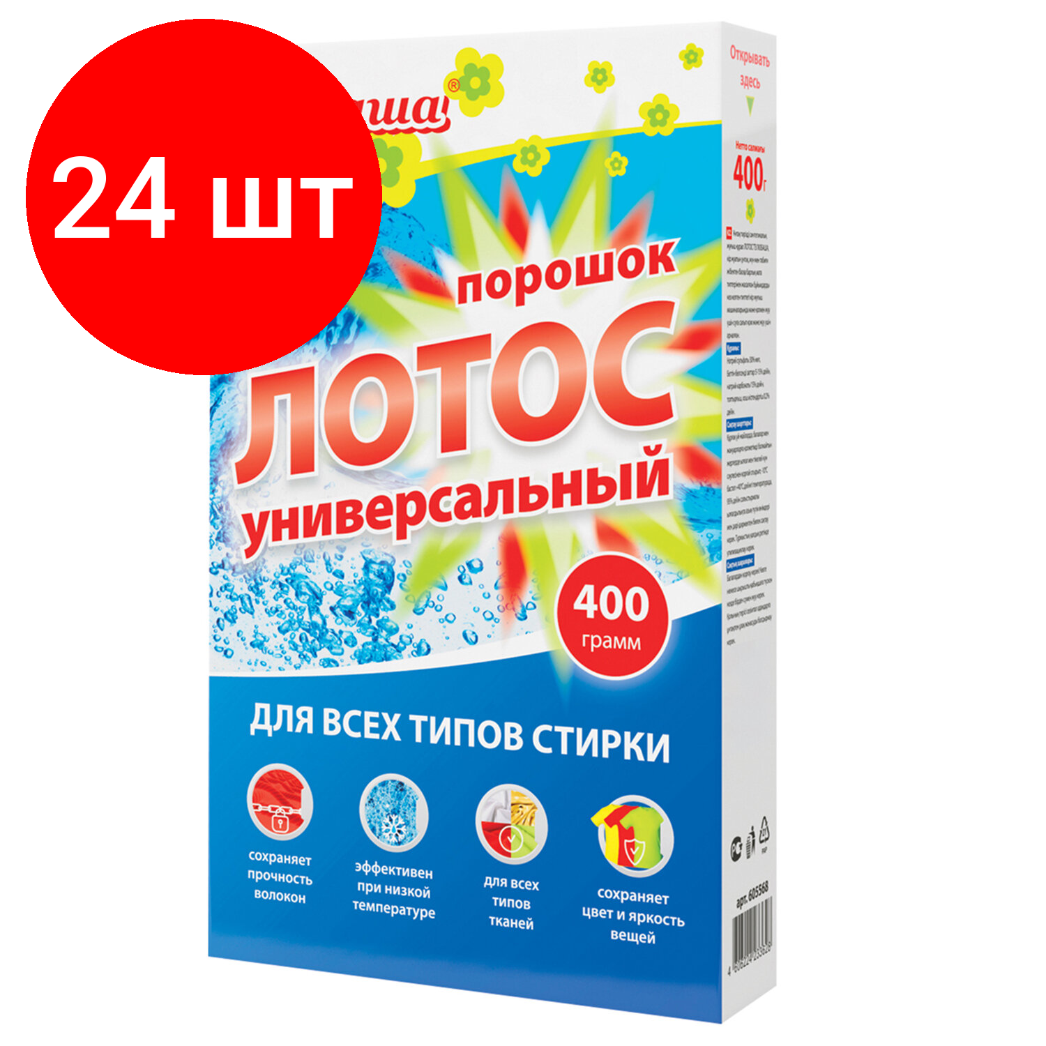 Комплект 24 шт, Стиральный порошок для всех типов стирки 400 г любаша «лотос», для всех типов тканей, 605568: сравнение цен, характеристики, фото, актуальное наличие и цены.