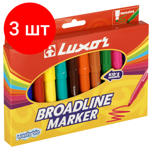 Внимание! Товар продается комплектом:[Фломастеры Luxor "Broadline", 12цв, утолщенные, смываемые, картон, европодвес] X 3 шт. Набор фломастеров Luxor Broadline – объёмные фломастеры для самых маленьких художников, благодаря которым удобно создавать яркие и красочные рисунки. В наборе 12 цветов для творчества: красный, жёлтый, коричневый, зелёный, чёрный, синий, оранжевый, розовый, светло-зелёный, светло-коричневый, голубой, фиолетовый. Набор упакован в картонную коробку. Фломастеры предназначены специально для детей от 3 лет. Они имеют специальное строение пишущего узла, который при сильном нажатии не деформируется и не вдавливается. Чернила на водной основе легко отстирываются с одежды и смываются с рук водой, абсолютно безопасны. Фломастеры имеют утолщенную круглую форму корпуса и безопасный вентилируемый колпачок, благодаря чему ими удобно рисовать маленьким художникам. • Количество цветов: 12; • Водная основа: безопасна для детей; • Особенности: специально для детей от 3 лет