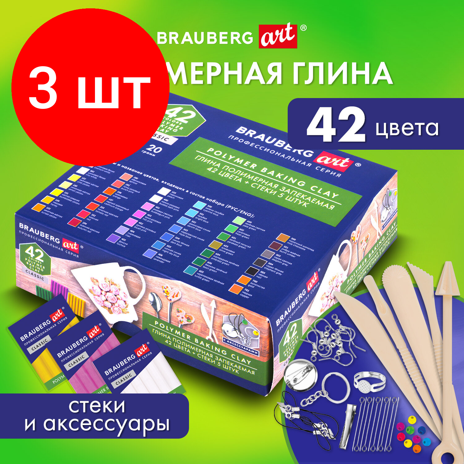 Комплект 3 шт, Глина полимерная запекаемая, набор 42 цвета по 20 г, аксессуары, подарочная коробка, BRAUBERG ART, 271165: сравнение цен, характеристики, фото, актуальное наличие и цены.