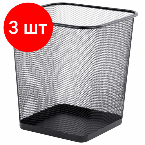 Внимание! Товар продается комплектом:[Корзина для бумаг квадратная 14 литров, BRAUBERG "Germanium", металл, черная, 237975] X 3 шт. Изготовлена из металлической сетки черного цвета. Объем - 14 л. Легкость и компактность корзины позволяют перемещать её с одного места на другое. Квадратная форма позволяет удобно разместить корзину под рабочим столом.