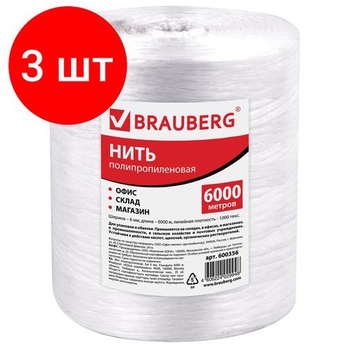 Купить Комплект 3 шт, Нить полипропиленовая, длина 6000 м, ширина 6 мм, линейная плотность 1000 текс, BRAUBERG, 600356 с доставкой по всей России.