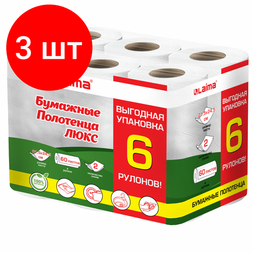 Внимание! Товар продается комплектом:[Полотенца бумажные 2-х слойные, спайка 6 рулонов (6х14.7м), LAIMA LUXE, 100% целлюлоза, 114742] X 3 шт. Изготовлены из 100% целлюлозы. В комплекте входят 6 рулона длиной 14,7 м каждый. Листы оптимального размера 24,5х21,5 см, с перфорацией. Влагопрочные, хорошо впитывают. Тиснение придает полотенцам дополнительную мягкость и позволяет впитывать еще больше жидкости.