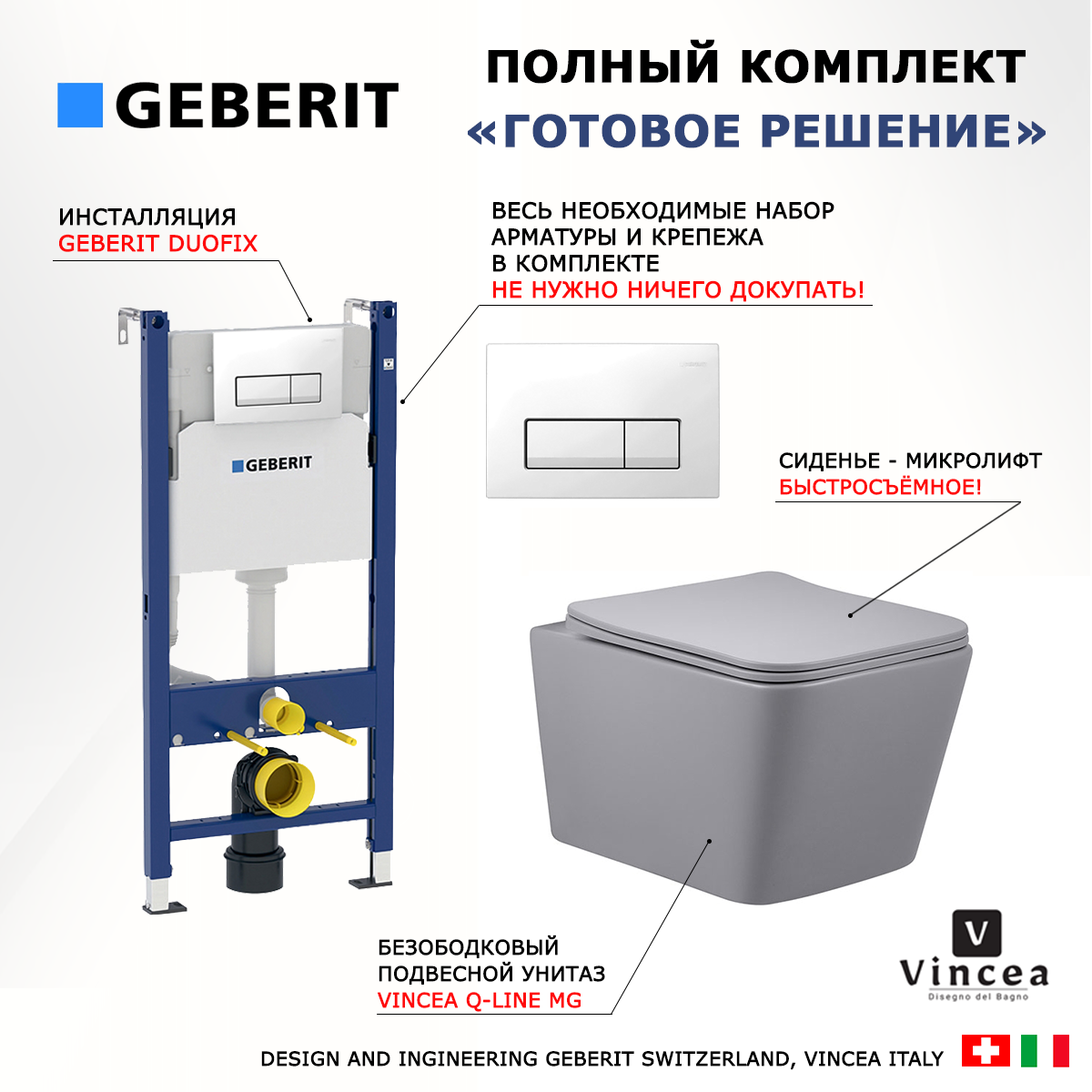 Купить Комплект 3 в 1 инсталляция Geberit Duofix + Унитаз подвесной Vincea Q-Line VT1-12MG + кнопка белая с доставкой по всей России.