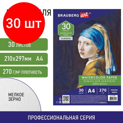 Купить Комплект 30 шт, Бумага для акварели А4, 30 л., мелкое зерно, 270 г/м2, BRAUBERG ART CLASSIC, «Девушка», 114401 с доставкой по всей России.