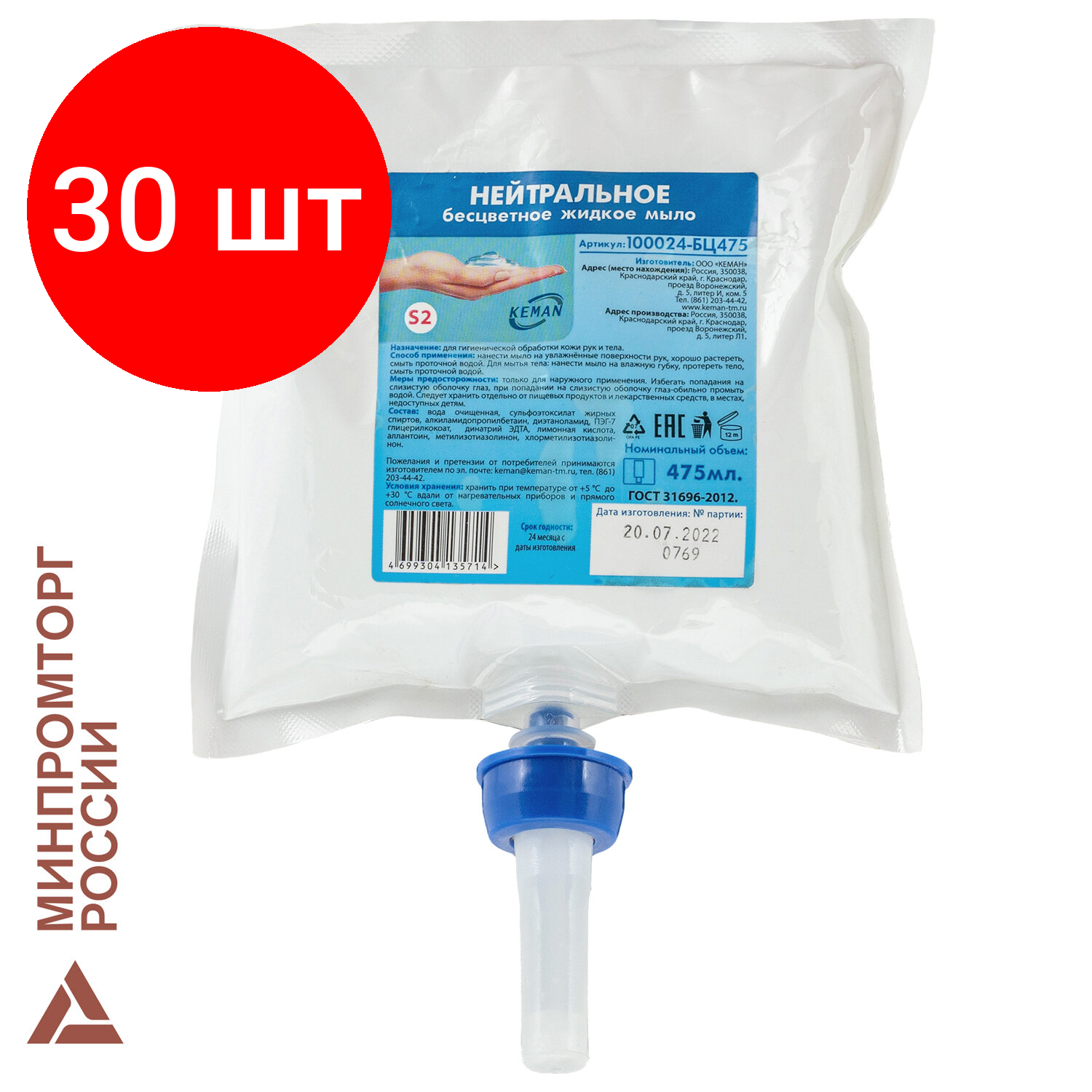 Купить Комплект 30 шт, Картридж с жидким мылом одноразовый (Система S2) «Нейтральное», бесцветное, 0.475 л, KEMAN, 100024-БЦ475 с доставкой по всей России.