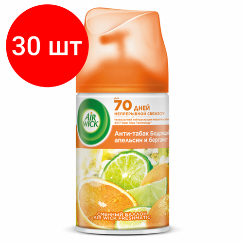 Внимание! Товар продается комплектом:[Сменный баллон 250 мл, AIRWICK "Анти-табак. Апельс/бергамот", для автоматических освежителей, универсальный, 224392] X 30 шт. Предназначен для ароматизации воздуха и удаления неприятных запахов в помещениях (офисе, ресторане, туалете, помещении для курения и т. д.). Содержит натуральные масла и экстракты.