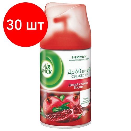 Внимание! Товар продается комплектом:[Сменный баллон 250 мл, AIRWICK "Дикий гранат", для автоматических освежителей, универсальный] X 30 шт. Предназначен для ароматизации воздуха и удаления неприятных запахов в любых помещениях.