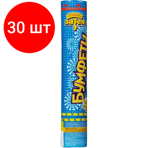 Внимание! Товар продается комплектом:[Хлопушка Бумфети 30см конф фольг золото 1501-1780] X 30 шт. Пневматическое устройство, абсолютно безопасное, предназначено для использования в помещении и на улице, дальность выстрела 6-8 м. Корпус изделия "Бумфети" состоит из двух частей: пневматического баллона со сжатым воздухом и картонного цилиндра с наполнителем. Баллон изготовлен из металла, надёжен и безопасен при хранении и в использовании, обладает высокой прочностью, чтобы выдержать давление воздуха. Выстреливает конфетти из золотой фольгированной бумаги. Веселье гарантировано! Размер изделия: 30 см.