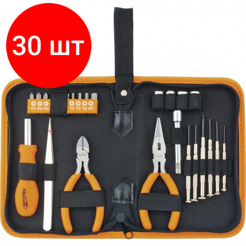 Длинногубцы; Бокорезы; Отвертка; Переходник; Пинцет; Удлинитель; Часовые отвертки - 6 шт; Торцевые головки 7, 8, 9, 10 мм и биты PH 1, PH 2, PH 3, SL 4, SL 6, SL 7, T 10, T 15, T 20; Пенал.