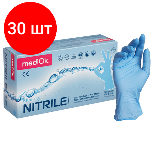 Комплект 30 упаковок, Мед. смотров. перчатки mediOk нитрил, голубой Blue Sky 4г, (M) 50пар/уп: сравнение цен, характеристики, фото, актуальное наличие и цены.