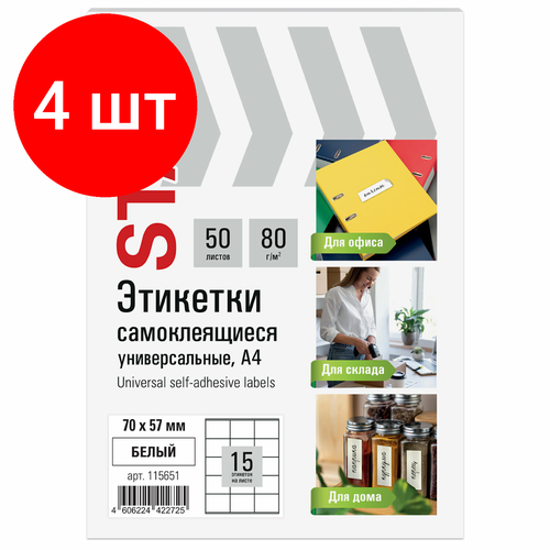 Внимание! Товар продаётся только в этом комплекте: [Этикетка самоклеящаяся 70х57 мм, 15 этикеток, белая, 80 г/м2, 50 листов, STAFF BASIC, 115651] X 4 шт. Если в карточке указано другое, ориентируйтесь на информацию выше. Изготовлены из самоклеящейся матовой бумаги плотностью 80 г/м2. Надежно приклеиваются к поверхности любой формы и материала. Картонная упаковка содержит 50 листов формата А4, на каждом листе – 15 этикеток размером 70х57 мм.