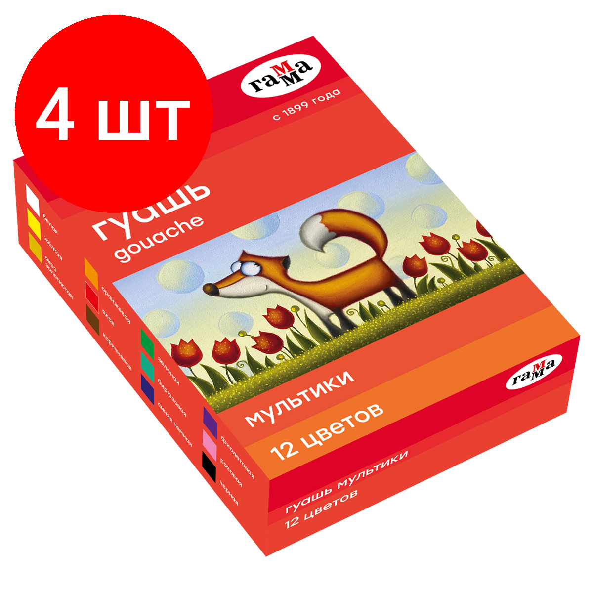 Гуашь гамма "Мультики", 12 цветов по 20 мл, картонная упаковка, 221032. Продается набором по (4 шт.) Для изготовления гуашевых красок используются натуральные высококачественные пигменты, повышающие светостойкость и насыщенность краски. Краски обладают улучшенной адгезией, поэтому они прекрасно разносятся по бумаге и сохраняют хорошую укрывистость. Состав набора: алая, белая, бирюзовая, желтая, зеленая, коричневая, оранжевая, охра золотистая, розовая, синяя темная, фиолетовая, черная.