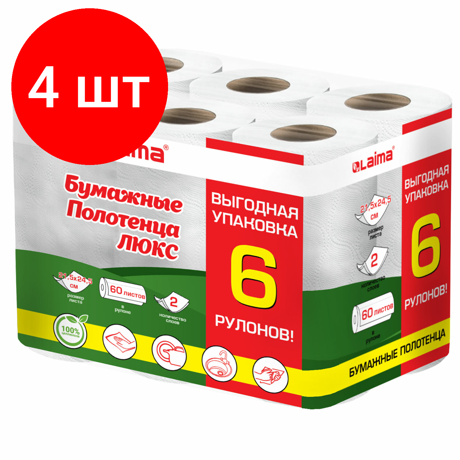 Комплект 4 шт, Полотенца бумажные 2-х слойные, спайка 6 рулонов (6х14.7м), LAIMA LUXE, 100% целлюлоза, 114742: сравнение цен, характеристики, фото, актуальное наличие и цены.