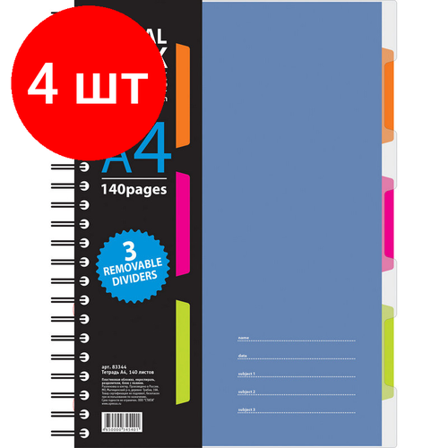 Купить Комплект 4 штук, Тетрадь 140л, кл, А4, SPIRAL BOOK Синий, евроспир, обл. пласт, раздел.84101 с доставкой по всей России.