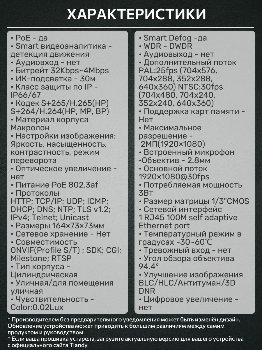 TIANDY IP-камера видеонаблюдения 2МП 2,8 мм TC-C321N I3/E/Y/2.8mm/V2.0 уличная цилиндрическая с микрофоном ИК CMOS PoE 1920х1080: сравнение цен, характеристики, фото, актуальное наличие и цены.