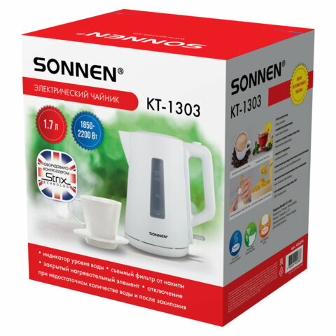 Комплект 5 шт, Чайник электрический SONNEN KT-1303, 1.7 л, 2200 Вт, пластик, белый, 456374: сравнение цен, характеристики, фото, актуальное наличие и цены.