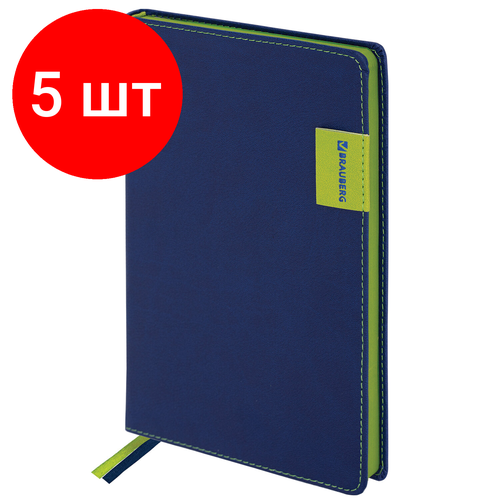Внимание! Товар продается комплектом:[Ежедневник недатированный А5 (138х213 мм), BRAUBERG "AIM", под кожу, 136 л, темно-синий, 113423] X 5 шт. Внутренний блок включает 136 листов белой бумаги плотностью 70 г/м2. Каждая страничка имеет перфорированный угол. Благодаря стандартному формату А5 ежедневник удобно использовать как в офисе, так и на выездных деловых встречах. Интегральная обложка стилизована под гладкую кожу и прошита по периметру. Подходит для горячего тиснения. Срез и форзац ежедневника окрашены в контрастный цвет с обложкой, что придает ему особый шарм. Дополнением являются две закладки-ляссе, с помощью которых можно быстро открыть или зафиксировать ежедневник на нужной странице, а также держатель для ручки на контрасте с обложкой.