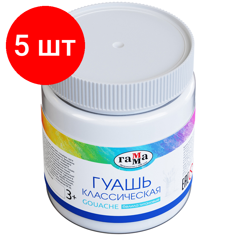 Внимание! Товар продается комплектом:[Гуашь Гамма "Классическая", белила титановые, 500мл] X 5 шт. Штучная гуашь белила титановые объёмом 500 мл серии «Классическая» предназначена для творческих занятий с детьми в школе и дома. Благодаря удобной герметичной баночке с завинчивающейся крышкой краска долго хранится, не высыхая. Детская гуашь разработана на основе качественного прозрачного связующего вещества, которое обеспечивает чистоту цветов. Краска плотная, укрывистая, хорошо смешивается и равномерно наносится практически на любую основу. При высыхании создаёт плотный красочный слой с бархатистым эффектом. Гуашь идеально подходит для групповых занятий в детских садах и школах, а также для тех, кто много рисует. Большого объёма краски хватит на целый класс. • Цвет: белила титановые; • Упаковка: баночка с завинчивающейся крышкой; • Объём баночки: 500 мл.