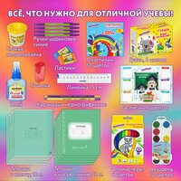 краски акварельные 12 цветов — 1 шт.; папка для рисования 10 л., А4 — 1 шт.; набор цветного картона и бумаги 8+8 цветов — 1 шт.; доска для лепки — 1 шт.; карандаши чернографитные — 2 шт.; карандаши цветные 12 цветов — 1 шт.; клей-карандаш — 1 шт.; ластик — 2 шт.; линейка 16 см — 1 шт.; ножницы — 1 шт.; пластилин 12 цветов — 1 шт.; ручки шариковые синие — 4 шт.; тетрадь в клетку 12 л. — 5 шт.; тетрадь в косую линию 12 л. — 5 шт.; точилка — 1 шт.; фломастеры 6 цветов — 1 шт.; набор кистей из 5 шт. – 1 шт.; стакан-непроливайка — 1 шт.; обложки для тетрадей и дневников — 10 шт.; папка-конверт с кнопкой А4 — 1 шт.; короб подарочный — 1 шт