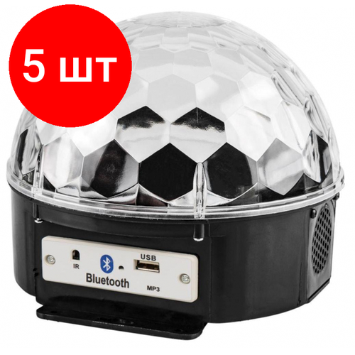 | Комплектация | Диско шар - 1 шт., подставка - 1 шт., шнур питания - 1 шт., евровилка - 1 шт., светодиод - 6 шт., динамик - 1 шт., пульт дистанционного управления - 1 шт., Bluetooth коннектор - 1 шт., USB порт для флешки - 1 шт., упаковка - 1 шт. |