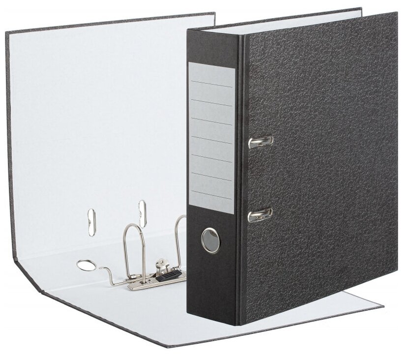 Папка-регистратор с арочным механизмом изготовлена из плотного картона. Внешняя и внутренняя стороны покрыты бумагой. Корешок - бумажный. На корешке шириной 80 мм есть кольцо для удобного захвата. Арочный механизм произведен в Чехии. Папка-регистратор вмещает до 600 листов стандартной плотности. Папка не имеет защиты по нижнему краю. Папка не имеет кармана на корешке.