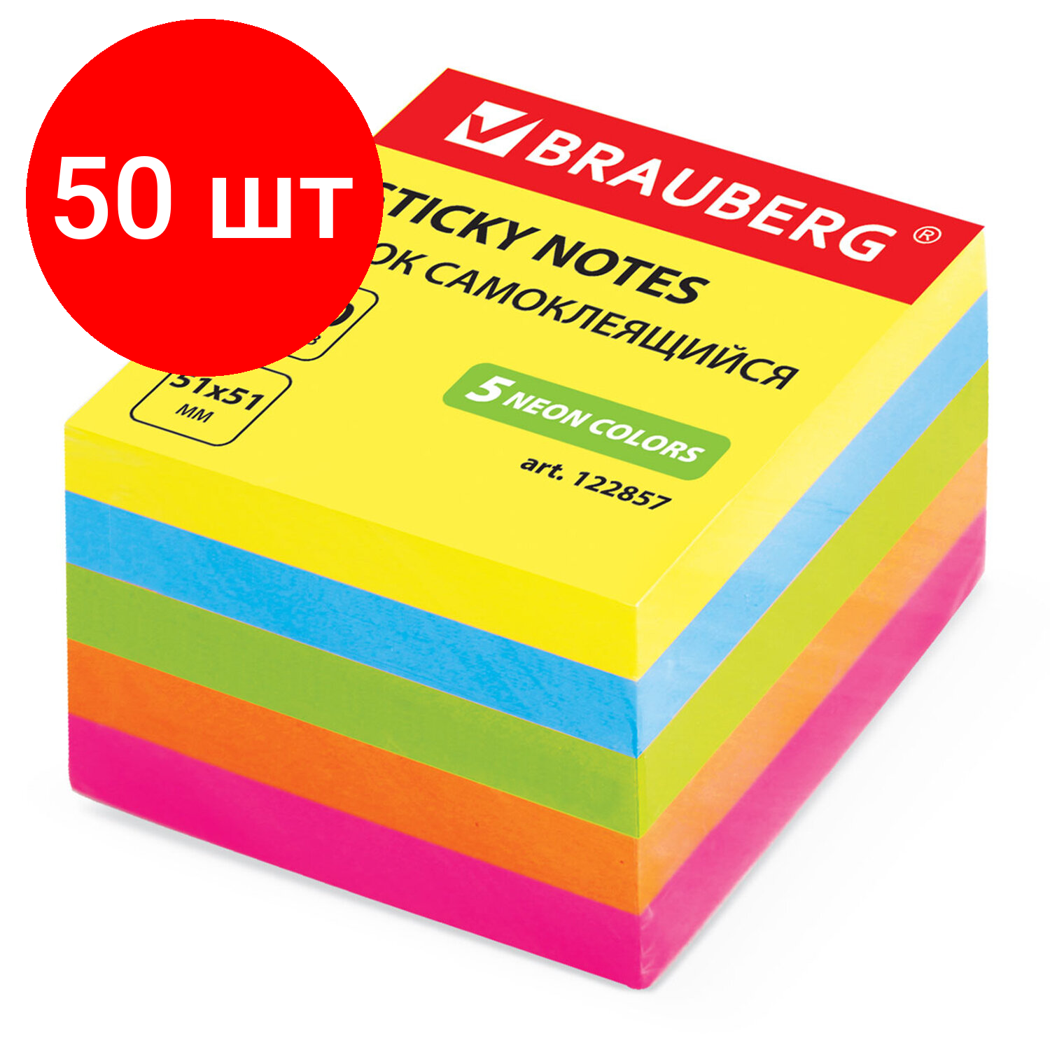 Комплект 50 шт, Блок самоклеящийся (стикеры), BRAUBERG, неоновый, 51х51 мм, 400 листов, 5 цветов, 122857: сравнение цен, характеристики, фото, актуальное наличие и цены.