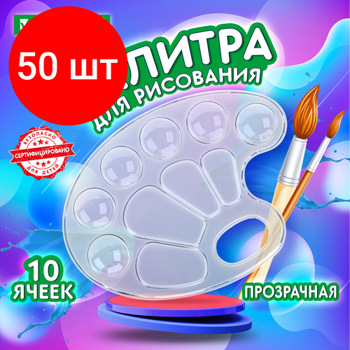 Купить Комплект 50 шт, Палитра для рисования BRAUBERG KIDS, прозрачная, овальная, 10 ячеек (6 ячеек для красок и 4 для смешивания), европодвес, 192354 с доставкой по всей России.