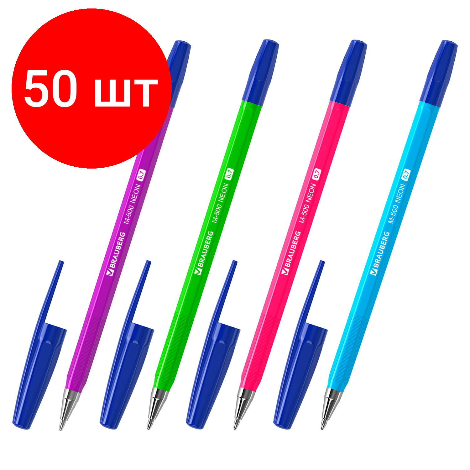 Комплект 50 шт, Ручка шариковая BRAUBERG «M-500 NEON», синяя, корпус ассорти, узел 0.7 мм, линия письма 0.35 мм, 143452: сравнение цен, характеристики, фото, актуальное наличие и цены.