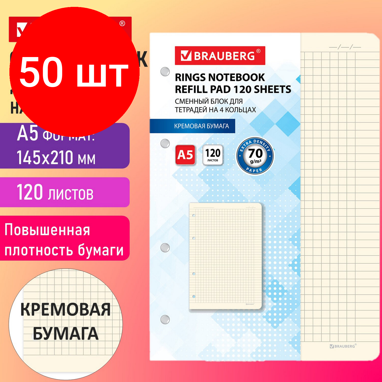 Комплект 50 шт, Сменный блок для тетрадей на 4 кольцах А5 120 л, BRAUBERG, повышенной плотности, кремовый, 403639: сравнение цен, характеристики, фото, актуальное наличие и цены.
