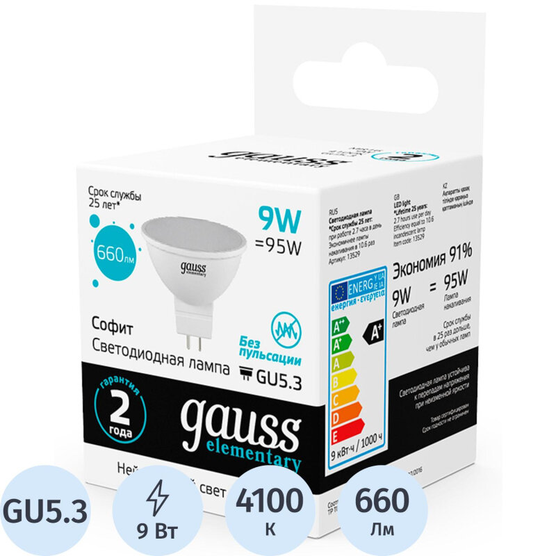 Комплект 50 штук, Лампа светодиодная Gauss Elementary 9W GU5.3 MR16 4100K 660lm 13529: сравнение цен, характеристики, фото, актуальное наличие и цены.