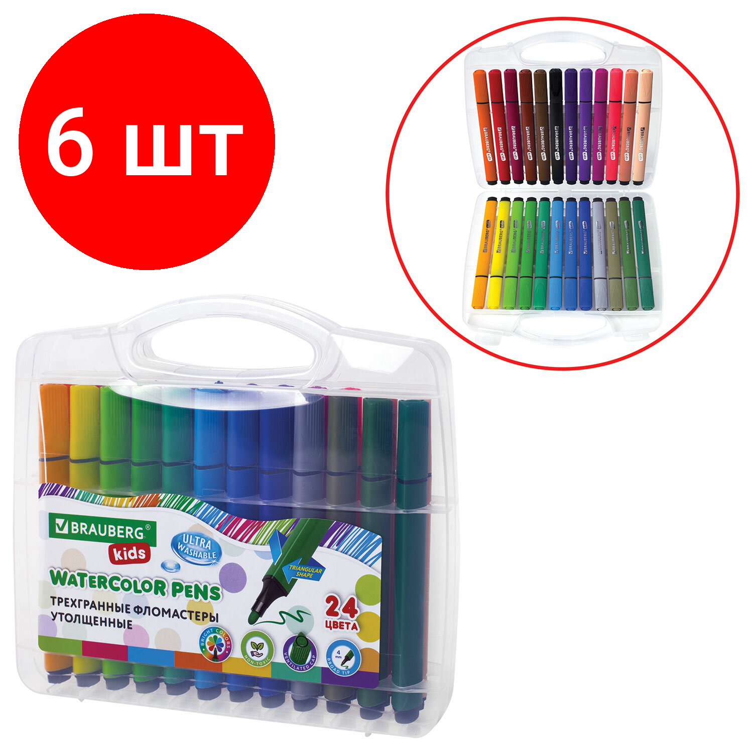 Комплект 6 шт, Фломастеры в пластиковом кейсе трехгранные утолщенные ультрасмываемые, BRAUBERG KIDS, 24 цвета, 152192: сравнение цен, характеристики, фото, актуальное наличие и цены.
