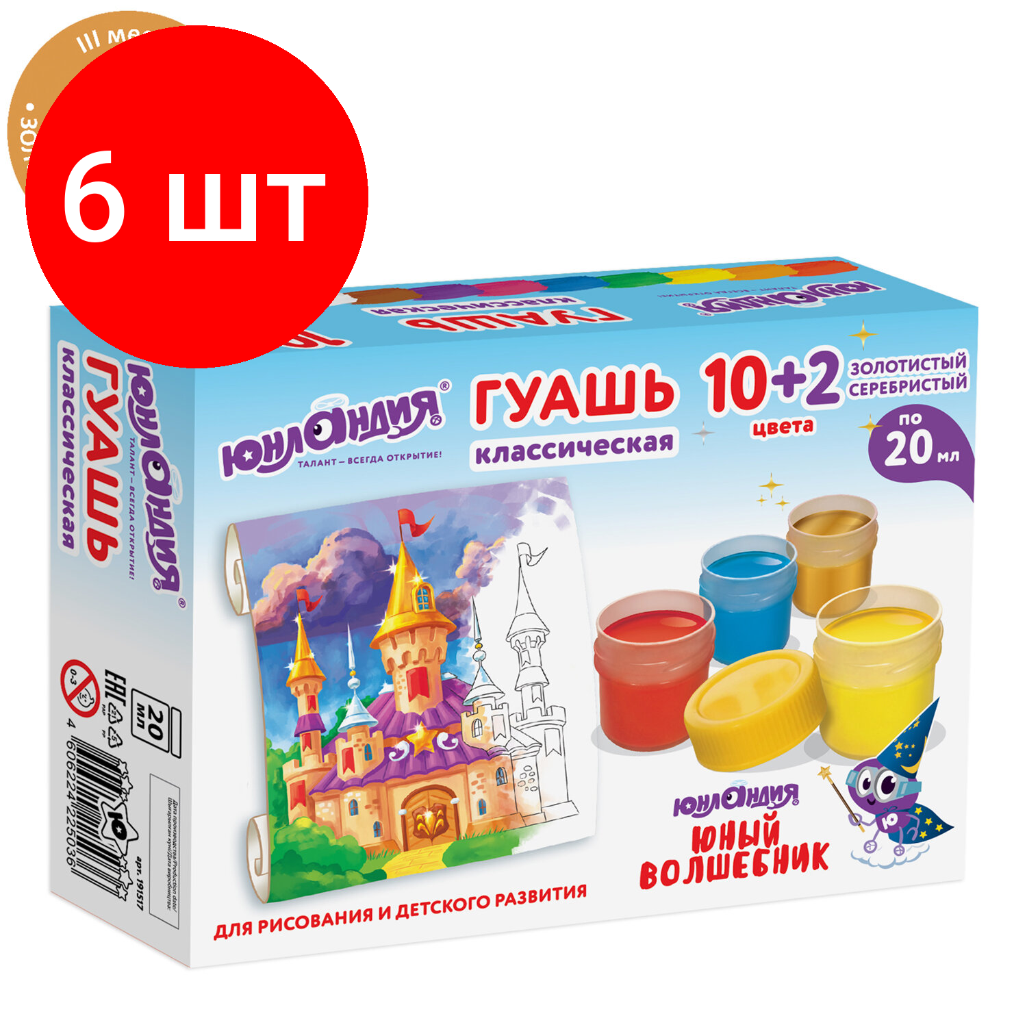 Комплект 6 шт, Гуашь юнландия «юный волшебник» 10+2 цвета (золотистый+серебристый) по 20 мл, без кисти, картон, 191517: сравнение цен, характеристики, фото, актуальное наличие и цены.